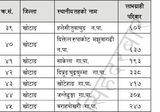 सरकारले आर्थिक वर्ष २०७८÷०७९ को बजेटमार्फत घोषणा गरेको विपन्न परिवारलाई १० हजार नगद प्रदान गर्ने कार्यविधि राजपत्रमा प्रकाशन गरेसँगै जिल्लाका २ हजार ७ सय ३९ अति विपन्न परिवारले राहतस्वरूप उक्त रकम पाउने भएका हुन् । जिल्लाको हलेसी तुवाचुङ नगरपालिकाका ६ सय २ र दिक्तेल रुपाकोट मझुवागढी नगरपालिकाका ६ सय ३७ अति विपन्न परिवारले राहत रकम पाउने राजपत्रमा उल्लेख छ ।