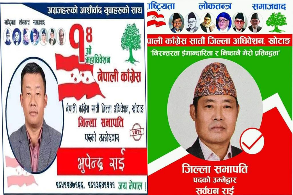 खोटाङ कार्तिक ५ : नेपाली कांग्रेसको खोटाङ जिल्ला सभापतिका आकंक्षी ४ जना मध्ये पुर्व राज्यमन्त्री सर्वधन राई र महाधिवेशन प्रतिनिध एवं दिप्रुङ चुईचुम्मा गाउँपालिकाका अध्यक्ष भुपेन्द्र राई मिलेर जाने भएका छन । नेपाली कांग्रेसको १४ औ महाधिवेशन अन्तरगत खोटाङमा भोली हुने जिल्ला अधिवेशनमा दुई समुह मिलेर जाने सहमति भएको हो ।