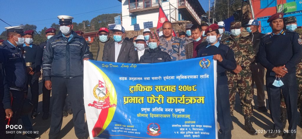 आन्तरिक मामिला तथा कानुन मन्त्रालय प्रदेश नं १ र १ नं प्रदेश ट्राफिक प्रहरी कार्यालय इटहरी, सुनसरीको आयोजना तथा जिल्ला प्रहरी कार्यालय खोटाङ र जिल्ला ट्राफिक प्रहरी कार्यालय खोटाङको सहकार्य र समन्वयमा आयोजित ट्राफिक सप्ताह एक हप्तासम्म विभिन्न ट्राफिक सचेतनामूलक कार्यक्रम गरी मनाइने जिल्ला ट्राफिक प्रहरी इन्चार्ज दिलबहादुर खत्रीले बताउनुभयो ।