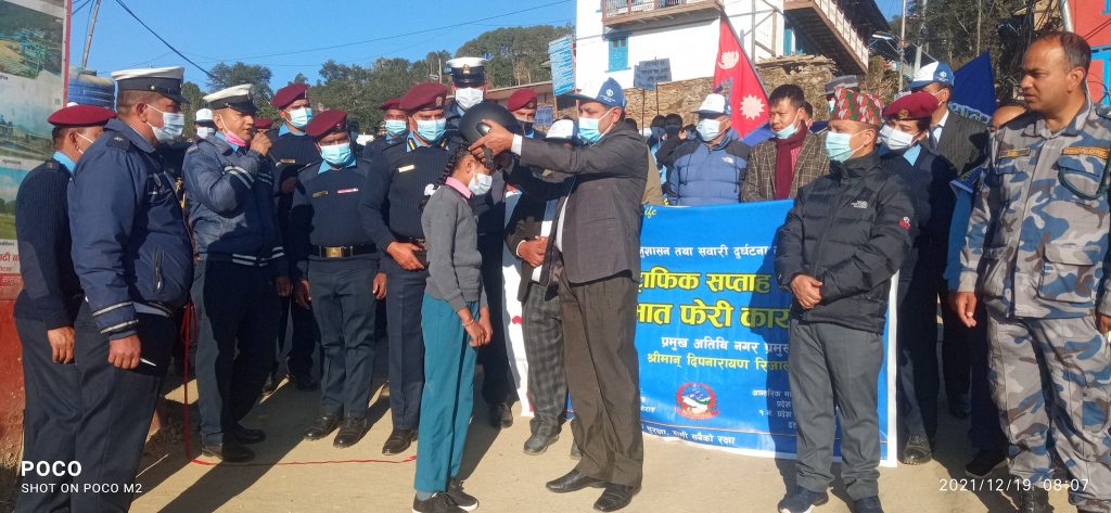 खोटाङमा सुरु सप्ताहको आज दिक्तेल रुपाकोट मझुवागढी नगरपालिकाका मेयर दीपनारायण रिजालले रिबन काटेपछि एक बालिकालाई हेल्मेट लगाइदिएर उद्घाटन गर्नुभएको हो ।