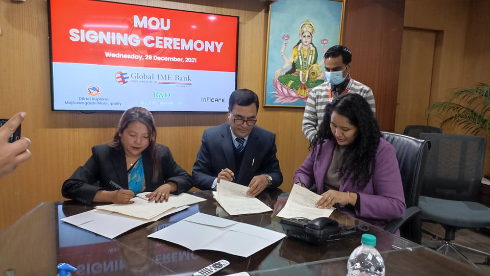 कृषि क्षेत्रको व्यवसायिकतामार्फत आत्मनिर्भर कृषक निर्माणका लागि आर एण्ड डि इनोभेटिभ सोलुसन प्रालिका प्रमुख कार्यकारी अधिकृत सुनिता न्हेमाफुकी, ग्वोवल आइएमई बैंकका प्रमुख कार्यकारी अधिकृत रत्नराज बज्राचार्य र दिक्तेल रुपाकोट मझुवागढी नगरपालिकाका उपमेयर बिणादेबी राईले बुधबार त्रि–पक्षीय समझदारी–पत्रमा हस्ताक्षर गरेका छन् ।
