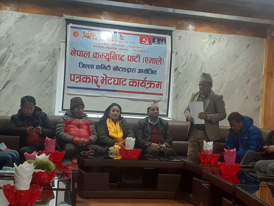 खोटाङ, पुस २५ । नेकपा एमाले खोटाङले भ्रष्टाचार र कालोबजारी विरुद्ध सशक्त आवाज उठाउने भएको छ । आज दिक्तेलस्थित होटल शुभदिनमा आयोजित पत्रकार भेटघाट कार्यक्रममा पार्टी जिल्ला सचिव कुमार आचार्यले पार्टीको नवनिर्वाचित कमिटीले भ्रष्टाचार र कालोबजारी विरुद्ध आवाज बुलन्द पार्ने बताउनुभएको हो ।