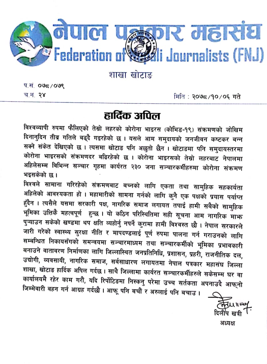 सरकारले जारी गरेको स्वास्थ्य सुरक्षा नीति र मापदण्डलाई पूर्ण रूपमा पालना गर्न गराउनको लागि सञ्चार माध्यम तथा सञ्चारकर्मीको भूमिका प्रभावकारी बनाउने वातावरण निर्माणका लागि महासंघले आग्रह गरेको हो । पत्रकार महासंघका जिल्ला अध्यक्ष दीलिप खत्रीले आज एक अपिल जारी गर्दै साझा प्रयासबाट मात्रा कोरोना नियन्त्रण सम्भव रहेकाले सबै पक्षलाई पत्रकारसँग सहकार्य र समन्वय गर्न आग्रह गर्नुभएको हो ।
