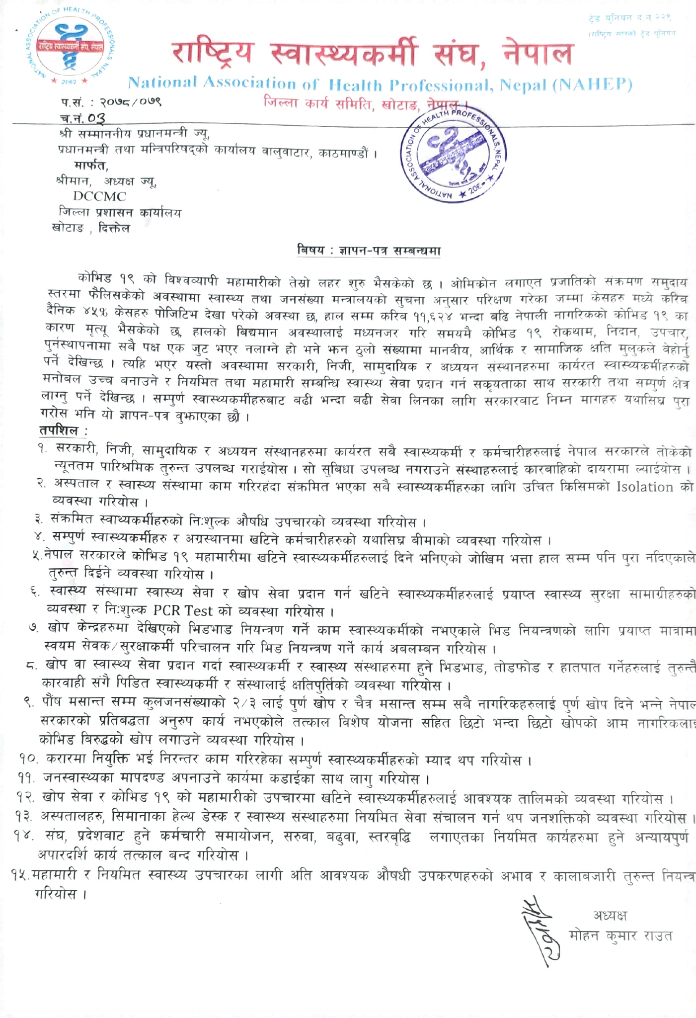 यस्तो छ स्वास्थ्यकर्मी संघले सरकारलाई बुझाएको ज्ञापनपत्र-