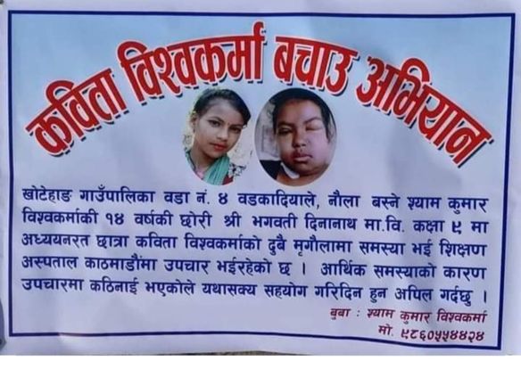 खोटेहाङ गाउँपालिका–७ खोटाङबजारस्थित भगवती दिनानाथ माविमा कक्षा ९ मा अध्ययनरत बालिका कविताको उपचारार्थ विद्यालय परिवार, सोही विद्यालयका पूर्व विद्यार्थी, सरकारी तथा गैरसरकारी संघ संस्था, देश तथा विदेशमा रहेका नेपालीलगायतले आर्थिक सहयोग गरेका हुन् ।