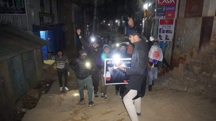 खोटाङ, माघ २० । नेकपा एमाले निकट विद्यार्थी संगठन अनेरास्ववियु खोटाङले बत्ती बालेर सरकार खोजेको छ । पेट्रोलियम पदार्थको मूल्य वृद्धि, सिटामोल जस्तो अत्यावश्यकीय औषधी अभावले नागरिकलाई मर्का पर्दा पनि मौन रहेकोप्रति अनेरास्ववियुले सरकारको ध्यानाकर्षण गराएको हो ।