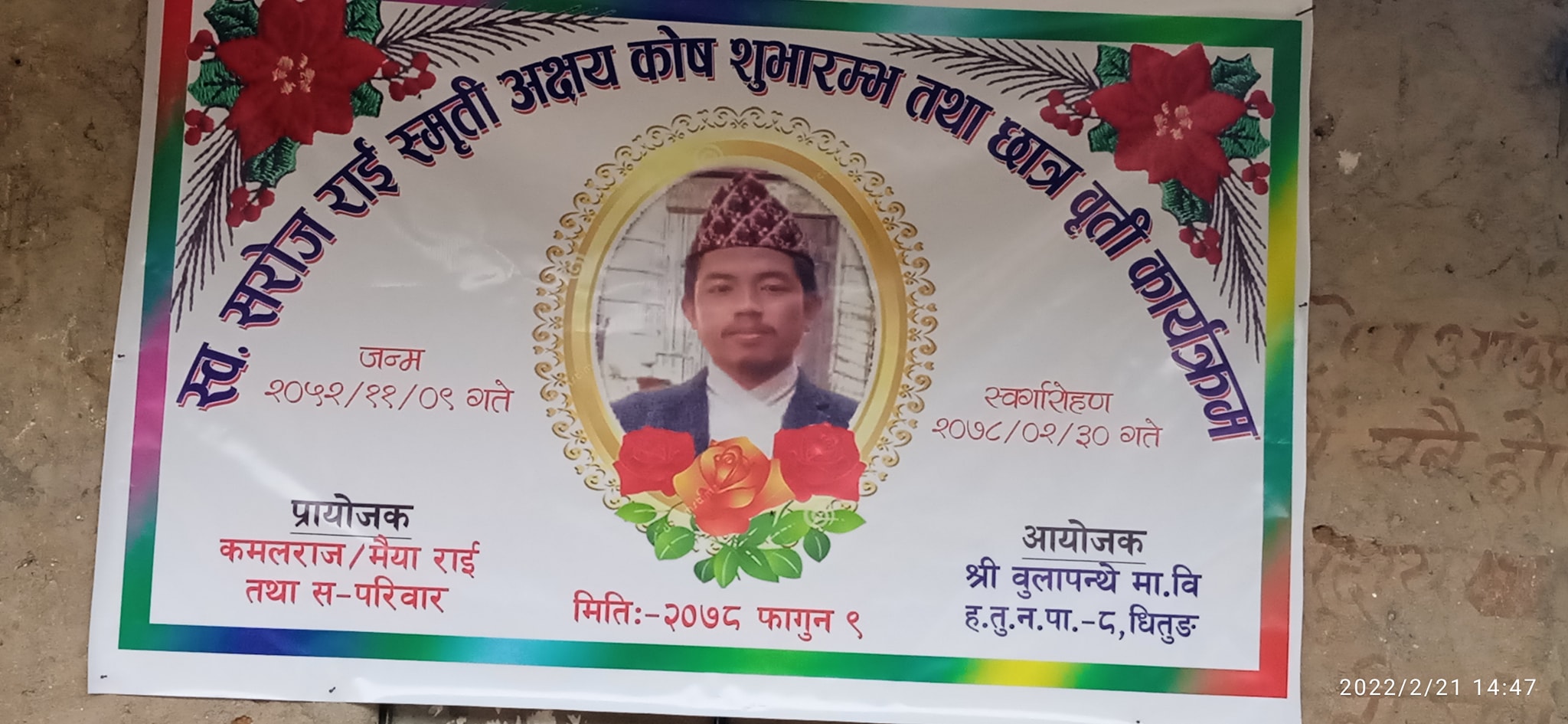 अक्षय कोष स्थापना गर्दै स्वर्गीय राईका वुबा कमलराज राई र दाई दुर्गमणि राईले १ लाख ११ हजार १ सय ११ रुपैयाँ विद्यालयलाई आज हस्तान्त्रण गर्नुभएको नेपाली कांग्रेस धितुङका वडा सभापति टेकराज राईले जानकारी दिनुभयो । कोष स्थापनासँगै विद्यालयका केहि विद्यार्थीलाई आजै छात्रवृत्ति पनि प्रदान गरिएको उहाँको भनाई छ ।