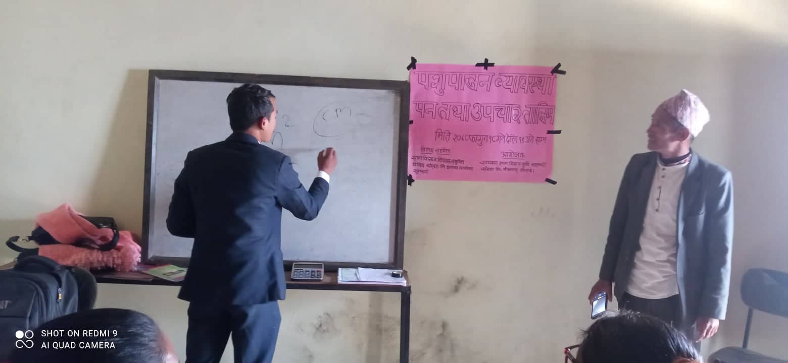 बुधबार र बिहिबार सञ्चालन भएको तालिमका सहभागीहरूलाई व्यावसायिक पशुपालन गर्दा ध्यान दिनुपर्ने कुरा, पशुहरूमा लाग्ने रोग र त्यसको उपचारलगायत विषयमा जानकारी प्रदान गरिएको सहकारीका प्रबन्धक खम्बराज कार्कीले जानकारी दिनुभयो ।