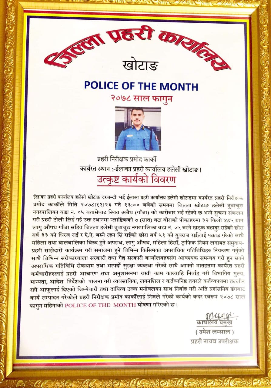 खोटाङ, वैशाख ३ । इलाका प्रहरी कार्यालय हलेसीमा प्रहरी प्रमुखको रूपमा कार्यरत प्रहरी निरीक्षक प्रमोद कार्की फागुन महिनाको उत्कृष्ट प्रहरी बन्नुभएको छ । जिल्ला प्रहरी कार्यालय खोटाङले प्रहरी निरीक्षक कार्कीले अपराध अनुसन्धानमा पुर्याउनुभएको योगदानको कदर गर्दै उत्कृष्ट प्रहरी घोषित गरेको हो । विभागिय मूल्य–मान्यता, आदेश–निर्देशनको पालना गर्दै व्यावसायिक, लगनशील र कर्तव्यनिष्ठ तवरले कर्तव्यपथमा तल्लीन रही उच्च मनोवल र साहसका साथ आफ्नो कर्तव्य निर्वाह गरेकाले उहाँलाई फागुन महिनाको उत्कृष्ट प्रहरी घोषित गरिएको जिल्ला प्रहरी प्रमुख प्रहरी नायव उपरीक्षक उमेश लम्सालले बताउनुभयो ।