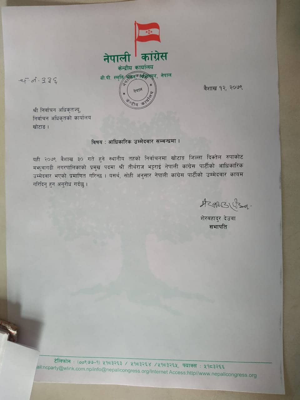 खोटाङ, वैशाख १२ । खोटाङको जिल्ला सदरमुकामसमेत रहेको दिक्तेल रुपकोट मझुवागढी नगरपालिकाको मेयरमा अन्ततः नेपाली कांग्रेसले तीर्थराज भट्टराईलाई उम्मेद्वार बनाएको छ ।