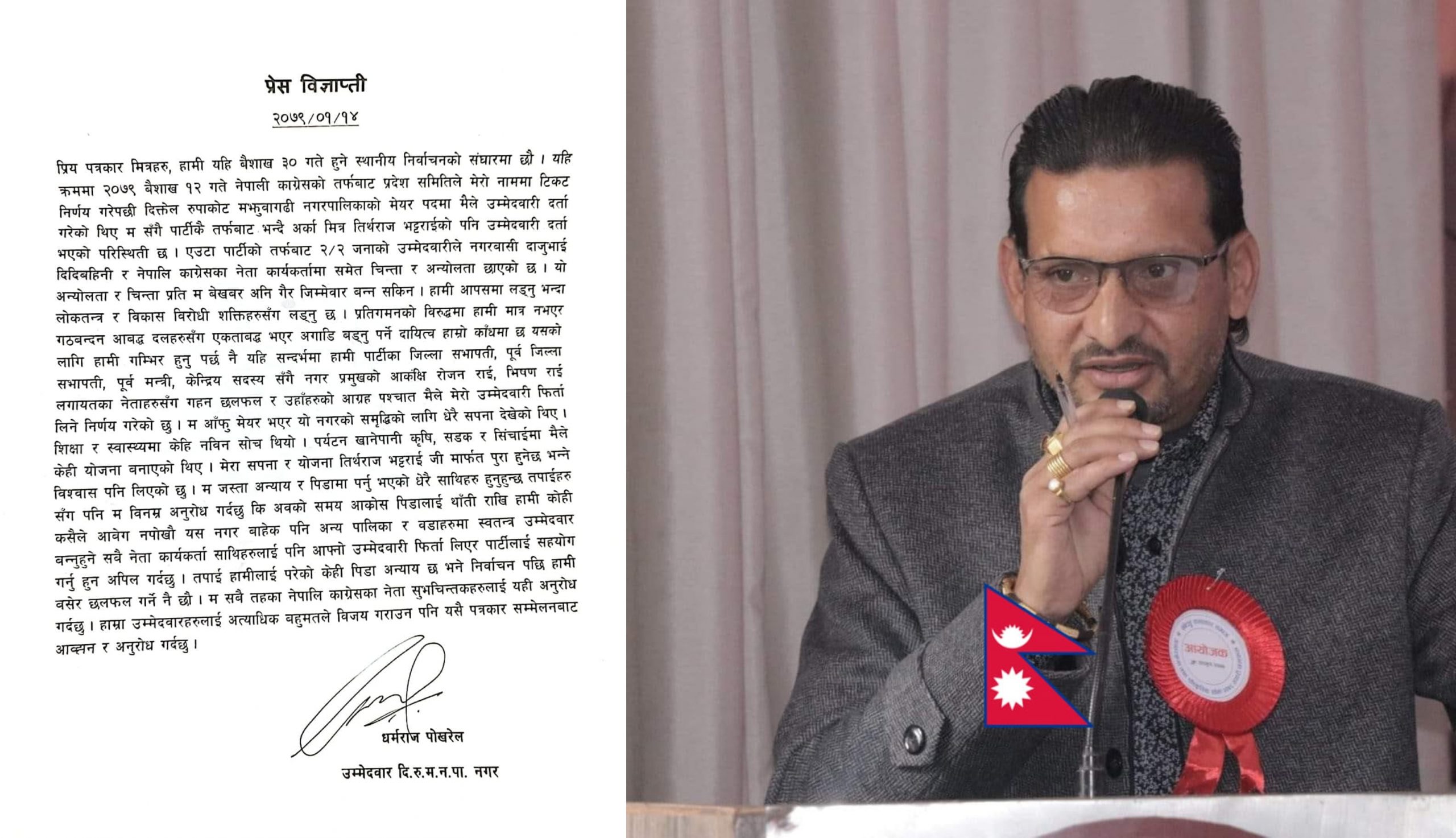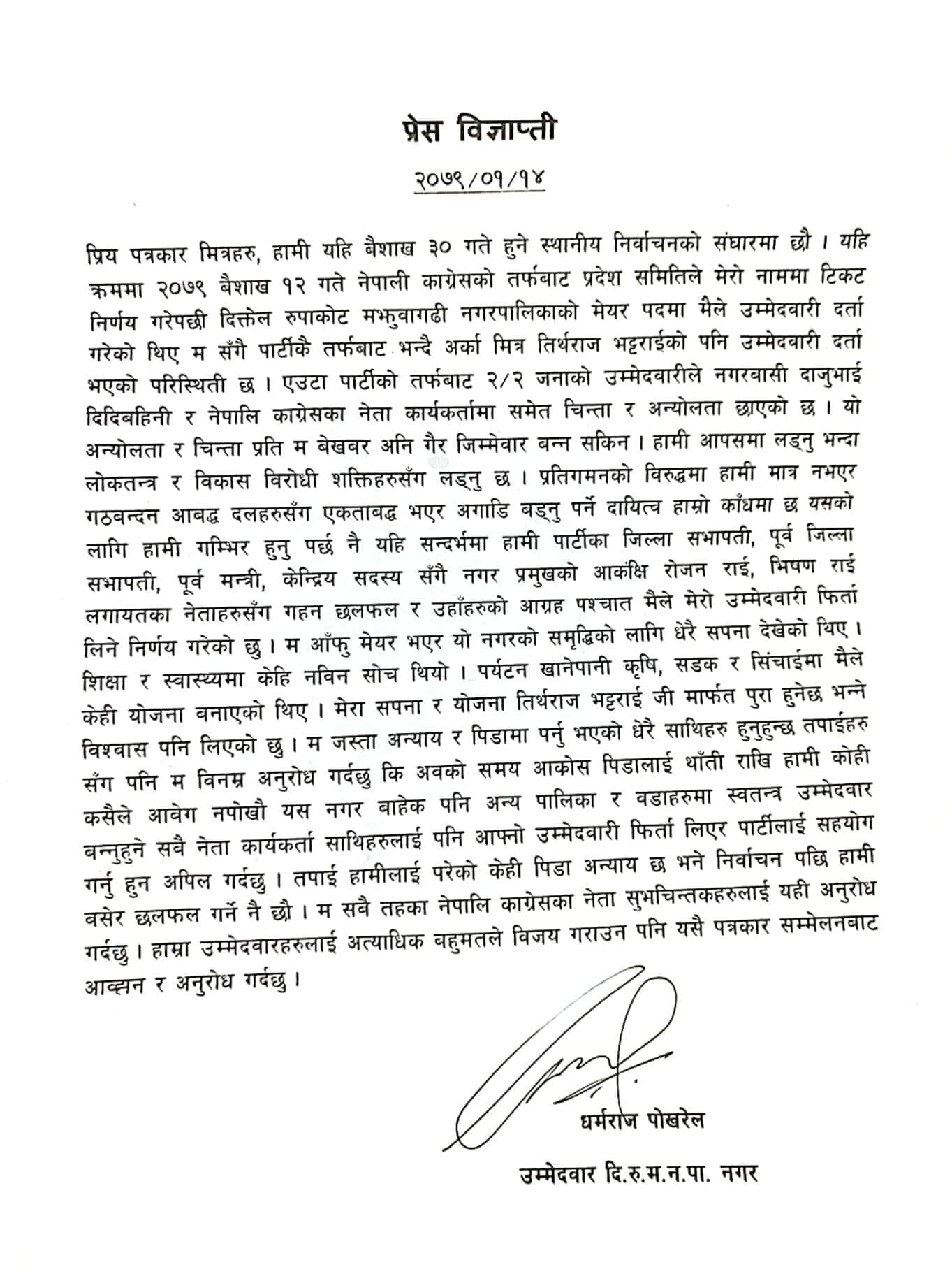 ‘एउटा पार्टीको तर्फबाट २/२ जनाको उम्मेदवारीले नगरबासी दाजुभाइ दिदीबहिनी र नेपाली कांग्रेसका नेता कार्यकर्तामा समेत चिन्ता र अन्योलता छाएको छ,’ पत्रकार सम्मेलनपछि पोखरेलले जारी गर्नुभएको विज्ञप्तिमा भनिएको छ, ‘यो अन्योलता र चिन्ताप्रति म बेखबर अनि गैरजिम्मेवार बन्न सकिनँ । हामी आपसमा लड्नुभन्दा लोकतन्त्र र विकासविरोधी शक्तिहरूसँग लड्नुछ ।’