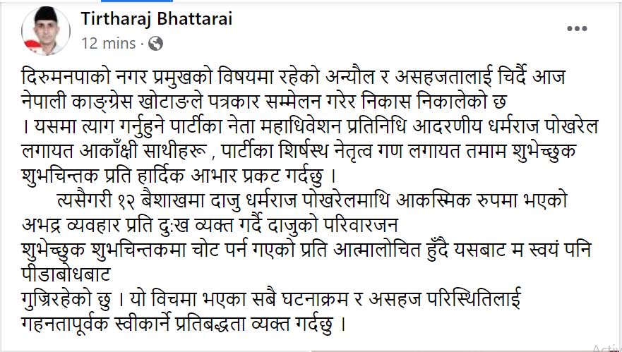 यता मेयरका उम्मेदवार भट्टराईले नगरप्रमुखका विषयमा रहेको अन्योल र असहजता चिर्न सफल भएर कांग्रेसले पत्रकार सम्मेलनमार्फत निकास निकालेको बताउनुभएको छ । सामाजिक सञ्जालमा फेसबुकमा लेख्दै उहाँले यसमा त्याग गर्ने पार्टीका नेता पोखरेलसहित नगरप्रमुखका आकांक्षी, पार्टीका शीर्षस्थ नेतृत्व, शुभेच्छुक–शुभचिन्तक सबैलाई आभार प्रकट गर्नुभएको छ । सोमबार पोखरेलमाथि कार्यकर्ताले आकस्मिक रूपमा गरेको अभद्र व्यवहारप्रति दुःख व्यक्त गर्दै बीचमा भएका सबै घटनाक्रम र असहज परिस्थितिलाई गहनतापूर्वक स्वीकार गर्ने प्रतिबद्धता भट्टराईले व्यक्त गर्नुभएको छ ।