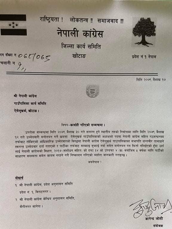 तामाङलाई कारबाही गरेको जिल्ला कार्यसमितिले पालिका समितिलाई पत्र पठाएर जानकारी दिएको छ । पत्रमा लेखिएको छ “गठवन्धनका तर्फबाट तोकिएको आधिकारिक उम्मेदवारको विरुद्धमा नेपाली काग्रेस ऐसेलुखर्क गाउपालिकाका सभापति शन्तबीर तामाङले स्वतन्त्र उम्मेदवार दर्ता गराएको र पार्टीका तर्फबाट सम्झाइ बुझाई गर्दा समेत मनोनयन पत्र फिर्ता नलिईएको हुँदा उहाँ लाई नेपाली कांग्रेसको विधान, २०१७ (संशोधन सहित) को दफा ३४ को उपदफा ४ (क) बमोजिम ५ वर्षका लागि पार्टीको साधारण सदस्यता समेत कायम नरहने गरी निष्काषन गरिएको व्यहोरा जानकारी गराइन्छ ।”