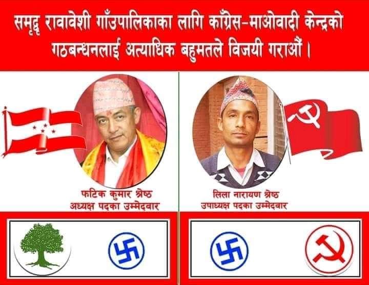 वैशाख ३० हुते हुने स्थानीय तहको निर्वाचनमा रावाबेसी गाउँपालिको अध्यक्ष र उपाध्यक्षकालागि नेपाली कांग्रेस र माओवादी केन्द्र बीच गठबन्धन छ । अध्यक्षमा कांग्रेसका फटिक कुमार श्रेष्ठ र उपाध्यक्षमा माओवादीका लिलानारायण श्रेष्ठ (सबिन) उम्मेद्वार रहेका छन् । त्यहाँका स्थानीय नागरिक र अघिल्लो निर्वाचनको मत परिणामलाई हेर्दा गठबन्धनका यी उम्मेद्वारहरुको विजयी शुनिश्चित जस्तै छ । तर चुनाव सोचे जस्तो भने हुने छैन् । पालिका अध्यक्षकालागि अन्य राजनीतिक दलका ब्यक्तिहरुको उम्मेद्वारी परेपनि गठबन्धनका फटिक श्रेष्ठ र एमालेका हरी पोखरेल बीच जीतकालागि प्रतिस्पर्दा हुने देखिन्छ ।