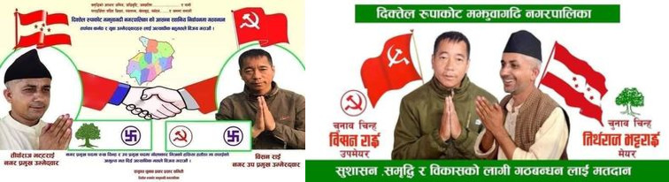 नेपाली कांग्रेस, नेकपा माओवादी, नेकपा एकीकृत समाजवादी र जनता समाजवादीपार्टी गरी चार दलीय गठबन्धन रहेको दिक्तेल रुपाकोट मझुवागढी नगरपालिकामा मेयरमा कांग्रेसका तिर्थराज भट्टराई र उप–मेयरमा माओवादीका विसन राई उम्मेद्वार छन् ।