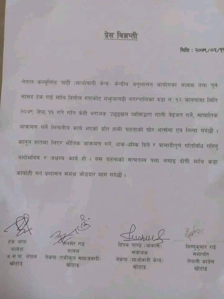 ‘…केही अराजक उच्छृंखल व्यक्तिद्वारा गाली बेइज्जत गर्ने, सांघातिक आक्रमण गर्ने निन्दनीय कार्य भएकोप्रति हामी घोर भत्र्सना एवं निन्दा गर्दछौँ,’ नेपाली कांग्रेस खोटाङका सभापति विष्णुकुमार राई, नेकपा माओवादी केन्द्र खोटाङका संयोजक दीपक पाण्डे ‘आकाश’, नेकपा एकीकृत समाजवादी खोटाङका अध्यक्ष जलशेर राई र जनता समाजवादी पार्टी खोटाङका अध्यक्ष टंक थापाद्वारा हस्ताक्षरित संयुक्त विज्ञप्तिमा भनिएको छ, ‘कानुन हातमा लिएर आक्रमण गर्ने, धाक–धम्की दिने र त्रासदीपूर्ण गतिविधि गरिनु अशोभनीय र अक्षम्य कार्य हो ।’ गठबन्धनले घटनाको सत्यतथ्य पत्ता लगाई दोषीमाथि कडा कारबाही गर्न प्रशासनसमक्ष माग गरेको छ ।
