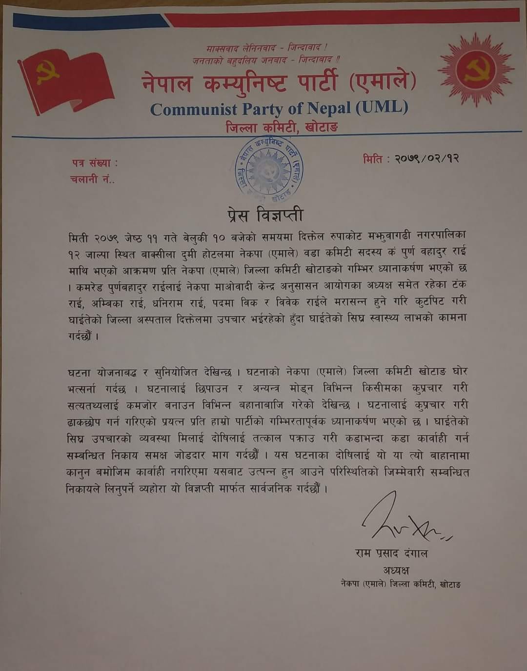 ‘घटनालाई कुप्रचार गरी ढाकछोप गर्न गरिएको प्रयत्नप्रति हाम्रो पार्टीको गम्भीर ध्यानाकर्षण भएको छ,’ एमाले खोटाङका अध्यक्ष रामप्रसाद दंगालले जारी गर्नुभएको विज्ञप्तिमा भनिएको छ, ‘घाइतेको शीघ्र उपचारको व्यवस्था मिलाई दोषीलाई तत्काल पक्राउ गरी कडाभन्दा कडा कारबाही गर्न सम्बन्धित निकायसमक्ष जोडदार माग गर्दछौँ ।’ घटनाका दोषीलाई कुनै पनि बहानमा कारबाही नगरिए यसबाट उत्पन्न हुन आउने परिस्थितिको जिम्मेवारी सम्बन्धित निकायले लिनुपर्नेसमेत एमालेले चेतावनी दिएको छ ।