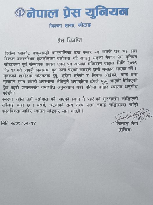 यसैबीच नेपाल प्रेस युनियन जिल्ला शाखा खोटाङले पनि घटनाको यथाशीघ्र अनुसन्धान गरी वास्तविकता बाहिर ल्याउन प्रहरी प्रशासनसँग माग गरेको छ । शनिबार साँझ एक विज्ञप्ति जारी गर्दै युनियनले युनियन खोटाङका पूर्वसंस्थापक सदस्य एवं पूर्वअध्यक्ष दाहालको शरीरमा चोटपटक हुनु, भुइँमा सुतेको र सिरक ओढेको, नाक तथा मुखबाट रगत बगेको अवस्थामा भेटिनुले अप्राकृतिक ढंगले मृत्यु भएको देखिएको बताएको छ ।