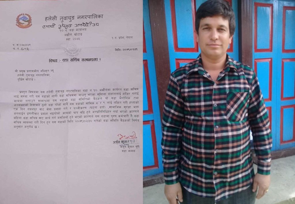 नगरमा पठाएको पत्रमा भनिएको छ, ‘महिला वडा सचिवबाट असजिलो हुने भएको कारणले यस वडामा पुरुष कर्मचारी नै वडा सचिव व्यवस्था गरिदिनुहुन यस वडाको मिति २०७९ जेठ ३० गतेको वडा समिति बैठकको निर्णय अनुसार अनुरोध छ।’