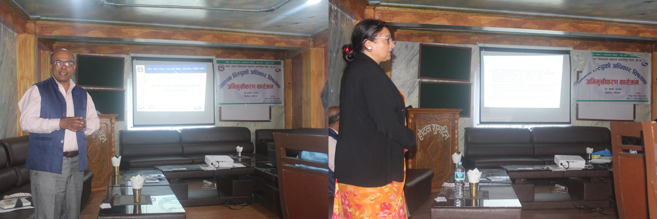 दिक्तेल स्थित होटल शुभदिनमा शुक्रबार (आज) आयोजना गरिएको कार्याक्रममा यातना, यातना विरुद्धका प्रयास र राज्यले गर्नुपर्ने दायित्व सम्बन्धि आयोकका कार्यालय प्रमुख श्यामबाबु काफ्लेले अभिमुखीकरण गर्नुभएको थियो । यस्तै, यातना रोकथाम र नियन्त्रणमा सुरक्षाकर्मीको भूमिका सम्बन्धि जिल्ला प्रहरी कार्यालय खोटाङका सूचना अधिकारी एवं प्रहरी निरीक्षक रोमनराज अर्याल र यातनाजन्य कसूरमा अभियोजन सम्बन्धि व्यवस्थाका विषयमा सरकारी वकील कार्यालयका जिल्ला न्यायाधिवक्ता संगिता न्यौपाने ढुंगेलले अभिमुखीकरण गर्नुभएको हो ।