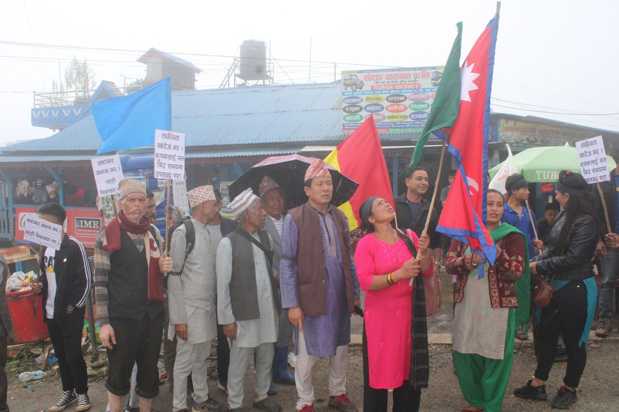 बिरोध प्रदर्शनमा संघीयता खारेज गर, किसानलाई समयमा मल दे, भ्रष्टाचार अन्त्य गर, बढ्दो महंगी नियन्त्रण गर, राष्ट्रहित विपरीत सन्धी सम्झौता खारेज गर लगातयको नारा लगाईएको थियो ।