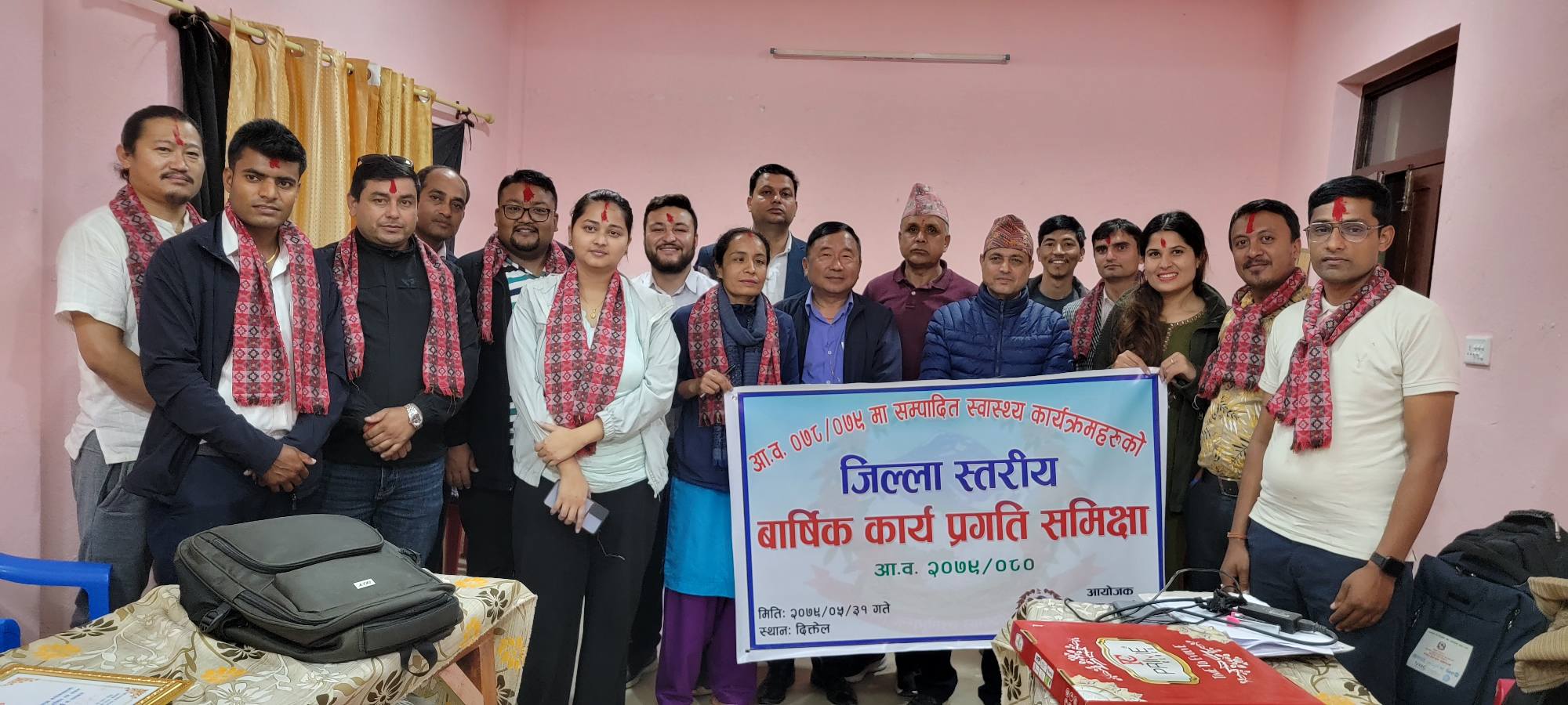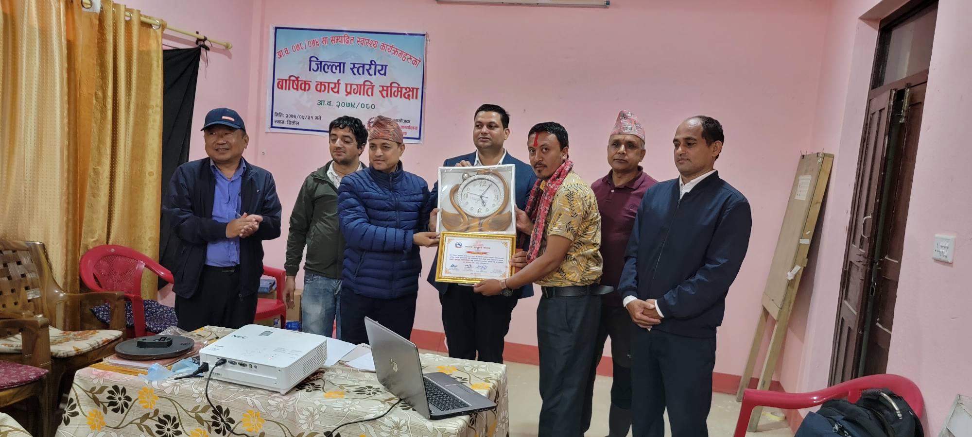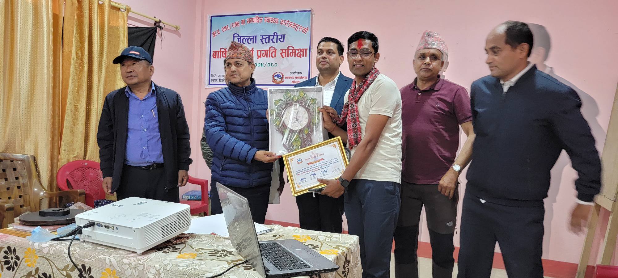 यस्तै, स्वास्थ्यकर्मी मध्ये वर्षभरी उत्कृट कार्य गर्ने तत्कालिन हलेसी तुवाचुङ नगरपालिकाका स्वास्थ्य शाखा प्रमुख तथा हाल दिक्तेल रुपाकोट मझुवागढी नगरपालिकाका स्वास्थ्य शाखा प्रमुख खेमराज आचार्यलाई स्वास्थ्य कार्यालयले सम्मान गरेको छ ।