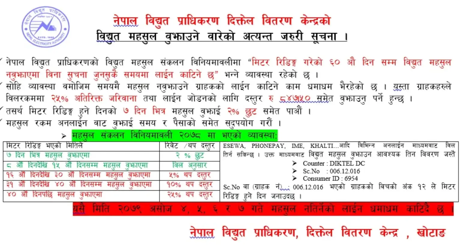 ‘नेपाल विद्युत प्राधिकरणको विद्युत महसुल संकलन विनियमावलीमा मिटर रिडिङ गरेको ६० औँ दिनसम्म विद्युत महसुल नबुझाएमा विना सूचना जुनसुकै समयमा लाइन काटिने व्यवस्था छ । सोही व्यवस्था बमोजिम समयमै महसुल नबुझाउने ग्राहकको लाइन धमाधम काटिने छ ।’ सूचनामा लेखिएको छ ।