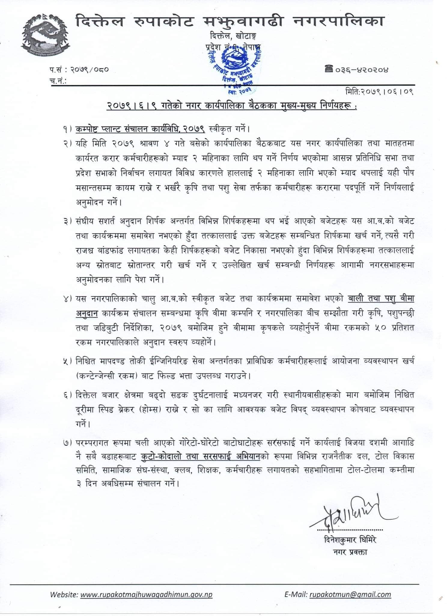 यस्तै, बालि तथा पशु बीमा अनुदान कार्यक्रम सञ्चालन सम्बन्धमा कृषि बीमा कम्पनि र नगरपालिका सम्झौता गरी कृषि पशुपन्क्षी तथा जडिबुटि निर्देशिका २०७९ बमोजिम हुने बीमामा कृषकले व्यहोर्नुपर्ने रकमको ५० प्रतिशत रकम नरपालिकाले अनुदान स्वरुप व्यहोर्ने । दिक्तेल बजारमा निश्चित दुरीमा स्पिड ब्रेकर (होम्स) राख्ने र सो का लागि आवश्यक बजेट विपद् व्यवस्थापन कोषबाट व्यवस्थापन गर्ने नगरकार्यपालिकाको बैठकले निर्णय गरेको बताइएको छ ।