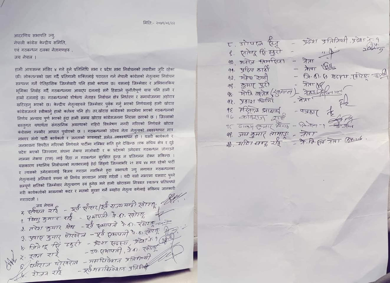 केन्द्रको उक्त निर्णयप्रति आपत्ति जनाउदै जिल्लाका कांग्रेसका शीर्षस्थानका नेताहरुले केन्द्रीय समितिलाई पत्र पठाएका छन् । जिल्लामा सबै भन्दा ठुलो पार्टी रहेको कांग्रेसको भागमा एउटा प्रदेश सभा मात्र पर्नु ठुलो अन्याय भएको र उक्त निर्णय नसच्याए स्वातन्त्र उम्मेद्वारी दिन सक्ने पत्रमा लेखिएको छ ।