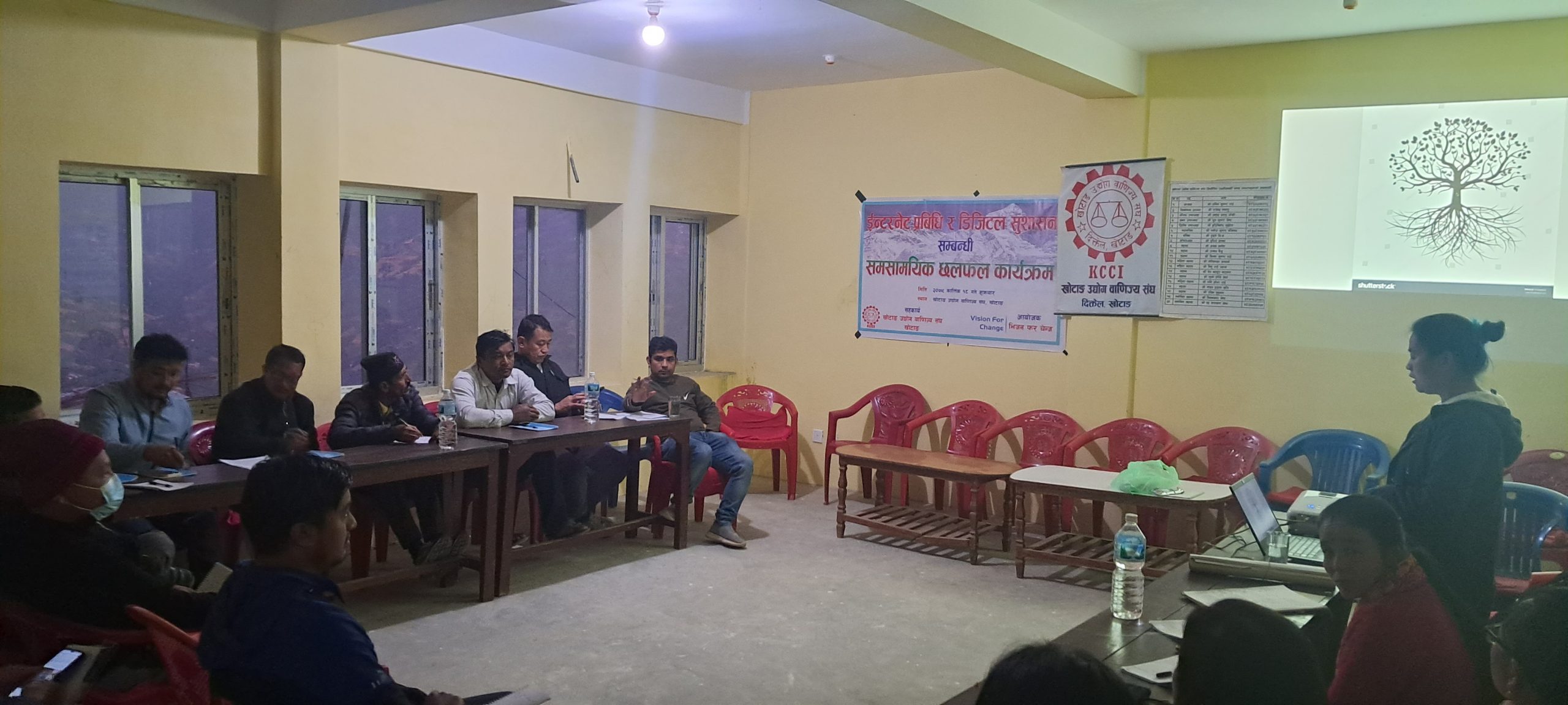 भिजन फर चेन्ज संस्थाको आयोजना तथा खोटाङ उद्योग वाणिज्य संघको सहकार्यमा शुक्रबार संघको कार्यालयमा छलफल कार्यक्रम भएको हो । कार्यक्रममा संघका अध्यक्षसहित अन्य पदाधिकारी, पत्रकार, महिला उद्यमी प्रतिनिधि, घरेलु तथा साना उद्योग संघका प्रतिनिधि लगायत विभिन्न संघ संगठनका प्रतिनिधिको उपस्थिती रहेको थियो ।