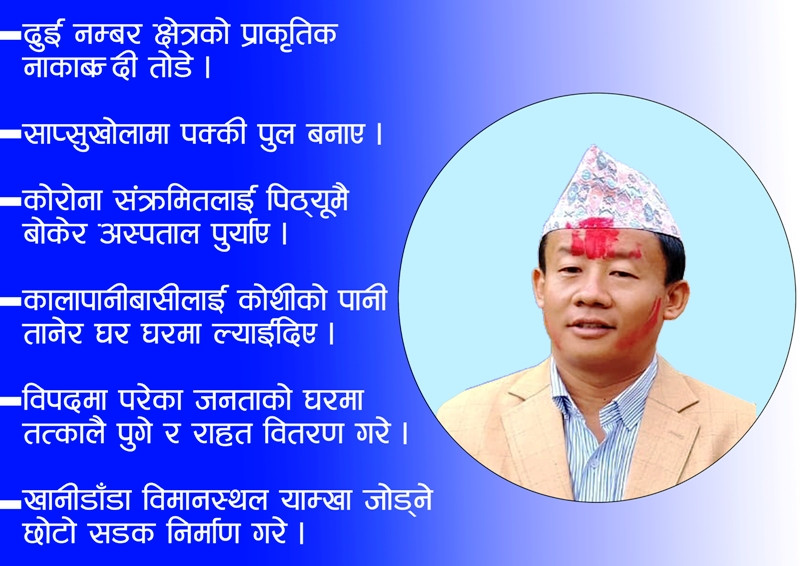 उनी त्यो बेला दिप्रुङ चुइचुम्मा गाउँपालिकाको अध्यक्षको भूमिकामा थिए। त्यो त्रासदीपूर्ण समयमा उनले कोरोना संक्रमितलाई पिठ्युँमा बोके। गाडीसम्म लगे, गाडीमा चढाएर आफैले कोभिड अस्पताल पु¥याए र बचाए। स्थानीय सरकार प्रमुखका रुपमा उनले कोभिडबाट आक्रान्त पालिकाबासीलाई ठाउँका ठाउँ राहत पु¥याउने व्यवस्था मिलाए ।