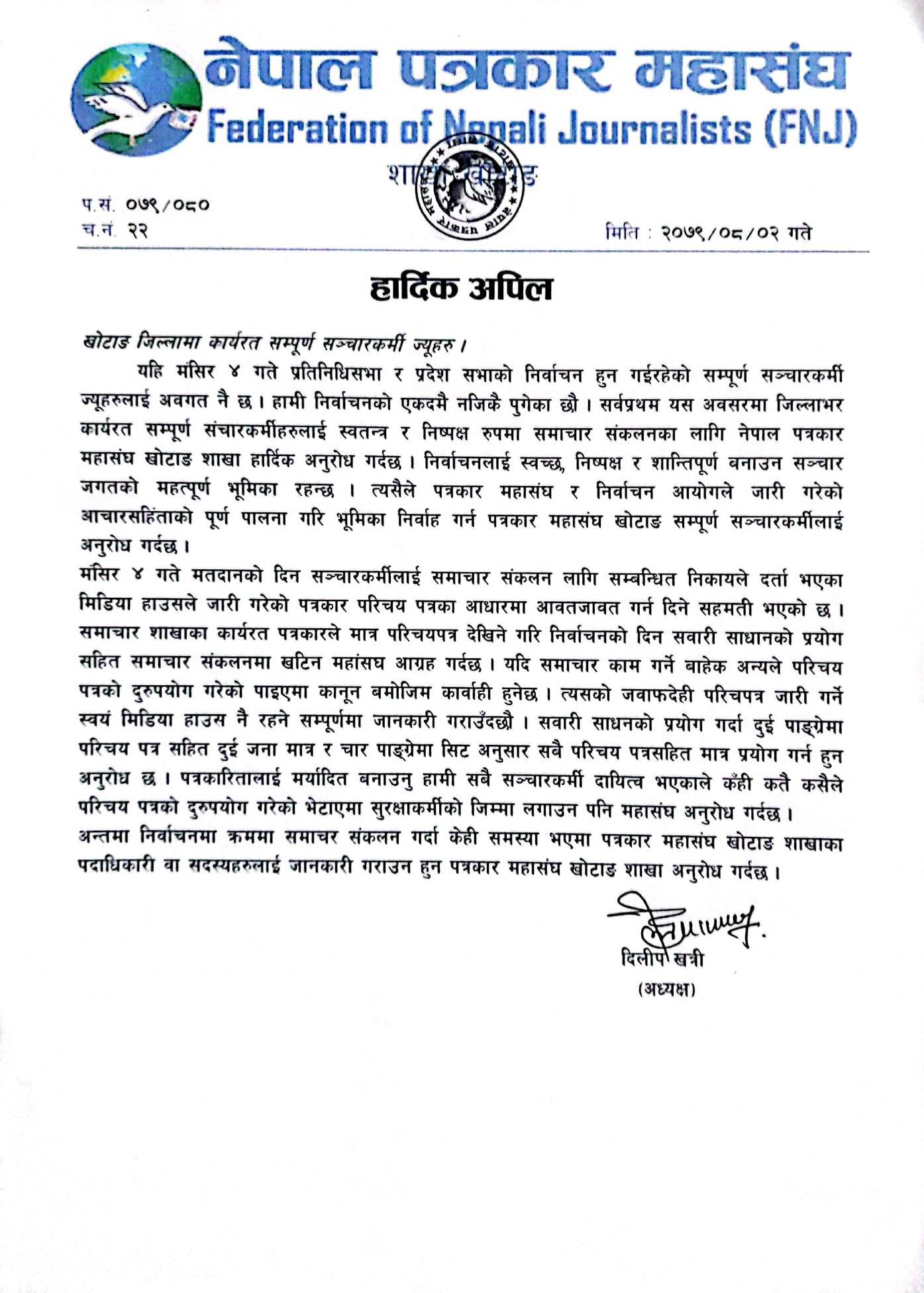 यस्तै, निर्वाचनमा क्रममा समाचर संकलन गर्दा केही समस्या भएमा पत्रकार महासंघ खोटाङ शाखाका पदाधिकारी वा सदस्यहरुलाई जानकारी गराउन पत्रकार महासंघ खोटाङ शाखाले अनुरोध गरेको छ ।