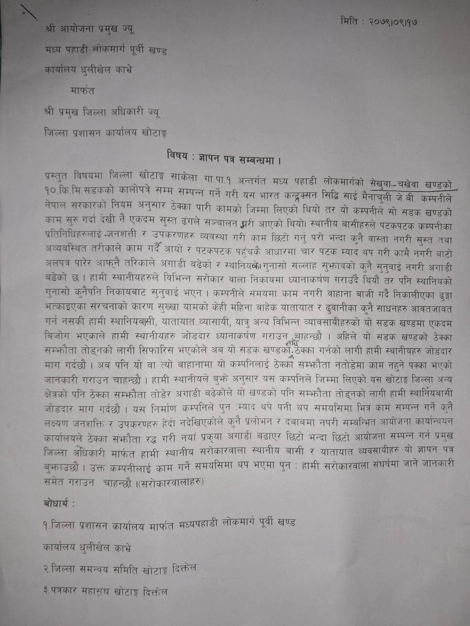 ज्ञापन पत्र बुझ्दै प्रजिअ सेडाइँले तत्काल सम्बन्धित निकायमा पठाउने बताउनुभयो । जिल्ला प्रशासन कार्यालयमार्फत पनि निर्माण कम्पनीलाई काम गर्न पटक पटक आग्रह गर्दा कुनै वास्ता नगरेको उहाँको भनाइ छ ।