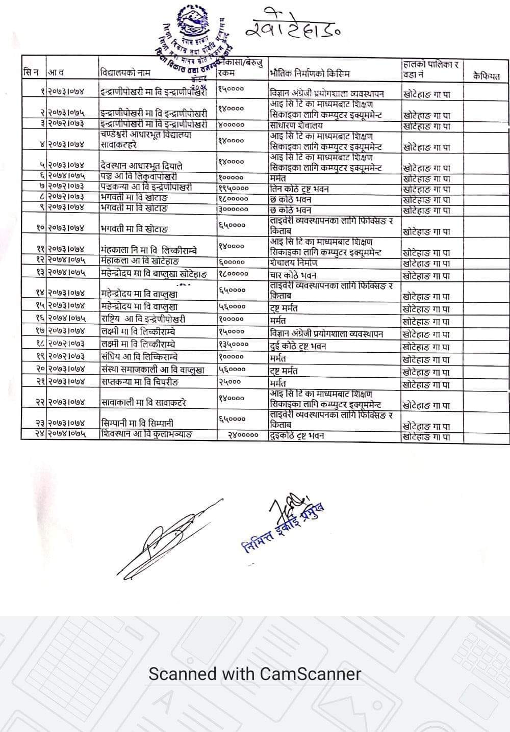 तत्कालीन जिल्ला शिक्षा कार्यालय र हाल शिक्षा विकास तथा समन्वय ईकाइ खोटाङबाट विद्यालयहरुले प्राप्त गरेका अधिकांश योजनाहरु बेरुजु देखिएका छन् । योजना सम्पन्न भए या नभएको कुनै उल्लेख नगरिएको, हालसम्म बिल भरपाई पेश नभएकाले ४६७ योजनाहरु महालेखाले बेरुजु देखाएको छ । उक्त योजनाहरुको रकम सम्परीक्षण गर्न गराउनको लागि शिक्षा तथा मानव स्रोत विकास केन्द्रबाट पटक पटक ताकेता गरिएको पाइएको छ । तर बेरुजु योजना फछ्र्यौटका लागि विद्यालयले चासो नदेखाएको शिक्षा विकास तथा समन्वय ईकाइ खोटाङमा कार्यारत इन्जिनियर बुधन यादवले बताउनुभयो ।