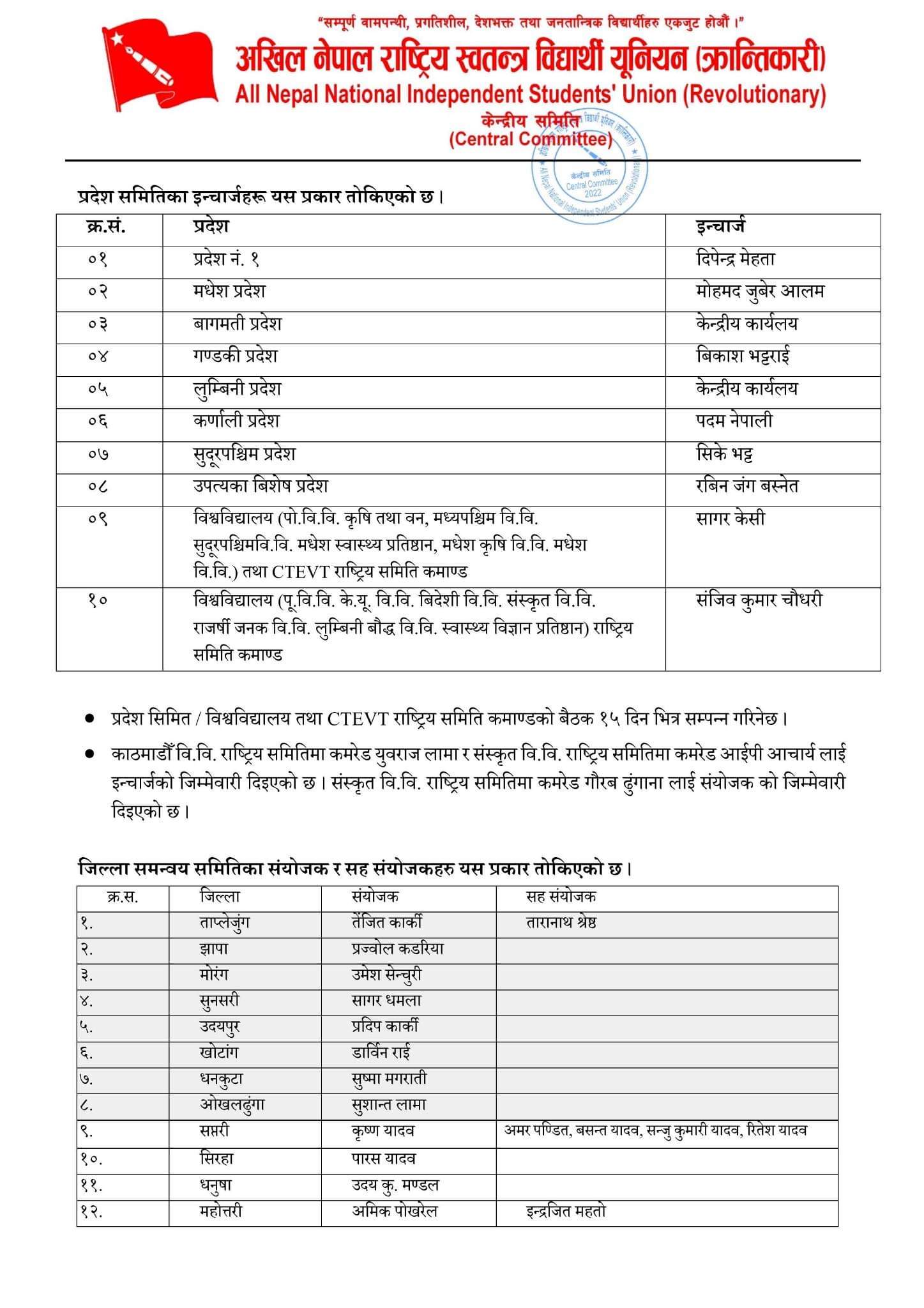 केन्द्रीय समानान्तर कमिटीको शुक्रबार बसेको बैठकले सातै प्रदेश समितिका इन्चार्ज, जिल्ला समन्वय समितिका संयोजक र सहसंयोजक, महानगरपालिका समितिका संयोजक र सह संयोजक, जिल्ला समन्वय समितिका इन्चार्ज र सहइन्चार्ज तोकेको एक विज्ञप्तिमार्फत् जानकारी गराइएको छ ।