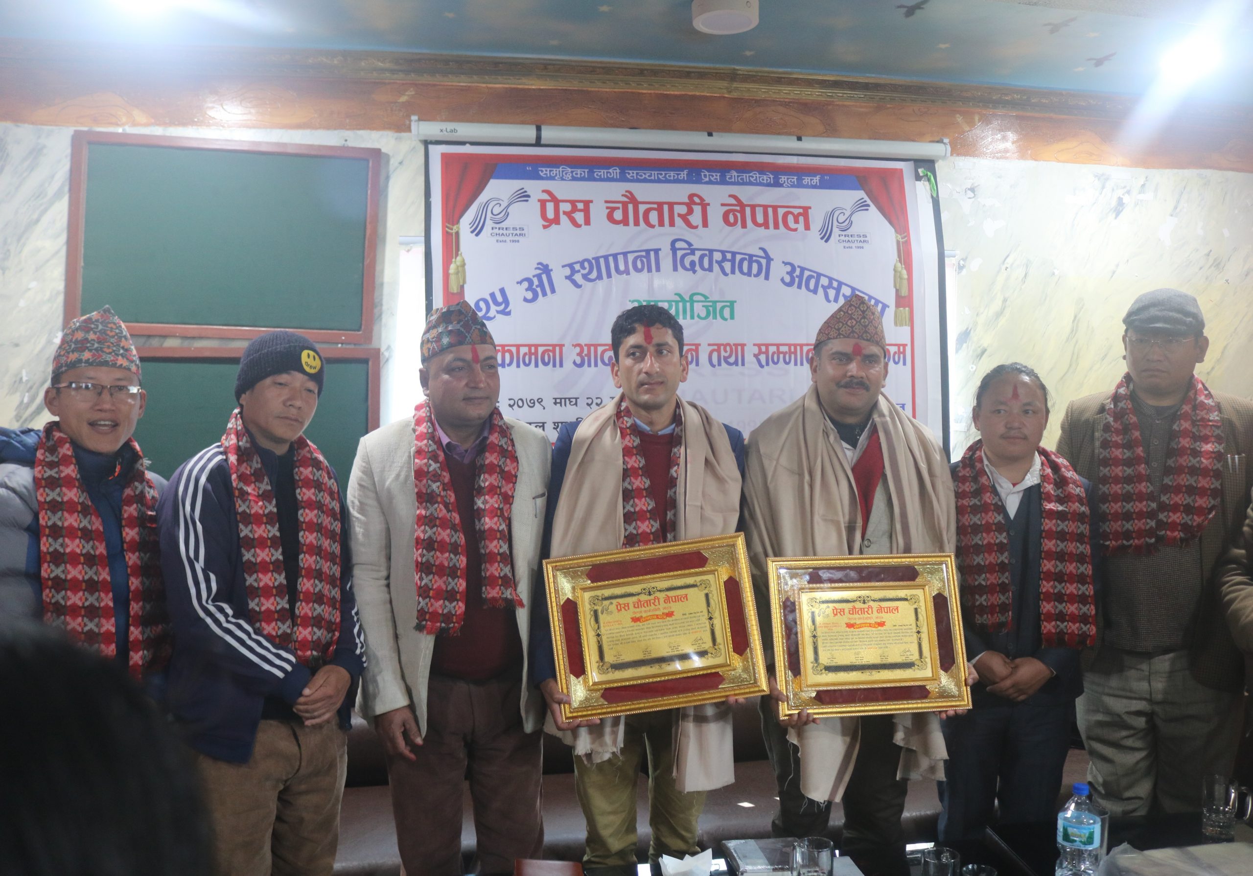 खोटाङ, माघ २२ । प्रेस चौतारी नेपाल खोटाङले आइतबार आफ्नो २५ औँ स्थापना दिवसका अवसरमा दुई पूर्व अध्यक्षलाई सम्मान गरेको छ । चौतारीको खोटाङ शाखाका संस्थापन अध्यक्ष रमेश पौडेल र पूर्व अध्यक्ष हरीबोल आचार्यलाई दोसल्ला ओढाएर सम्मानपत्रले सम्मान गरिएको हो ।