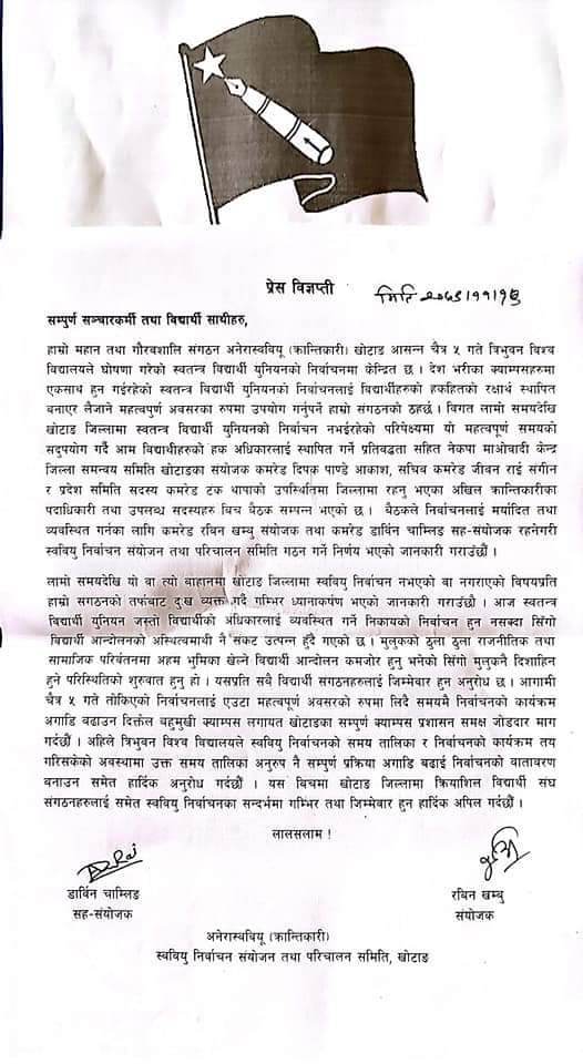 शुक्रबार क्याम्पसमा संगठन दर्ता गर्नु पर्ने त्रिभुवन विश्वविद्यालयको कार्यतालिका रहे पनि खोटाङको कुनै पनि क्याम्पसले निर्वाचन प्रक्रिया नै अगाडि नबढाएको भन्दै अनेरास्ववियु (क्रान्तीकारी) खोटाङले प्रेस विज्ञप्तिमार्फत आपत्ति जनाएको छ । तत्काल निर्वाचन प्रक्रिया अगाडि बढाइ तोकिएकै मितिमा निर्वाचन गराउन माग गर्दै दिक्तेल बहुमुखी क्याम्पसका निमित्त क्याम्पस प्रमुख कृष्ण कुमार राईलाई संगठनले विज्ञप्तिसमेत हस्तान्त्रण गरेको संयोजक खम्बुले बताउनुभयो ।