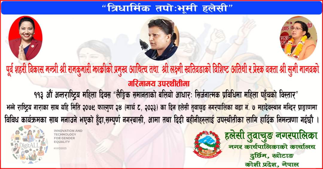 खोटाङ, फागुन २२ । खोटाङको हलेसी तुवाचुङ नगरपालिकाले फागुन २४ गतेका दिन मनाइने १३३ औं अन्तर्राष्ट्रिय महिला दिवस भब्यताका साथ मनाउने भएको छ । देशका दुई चर्चित महिला नेता, सामाजिक अभियान्ता प्रेरक वक्तासहितको उपस्थितिमा विभिन्न साँस्कृतिक कार्यक्रम गरिने नगरपालिकाले जनाएको छ ।