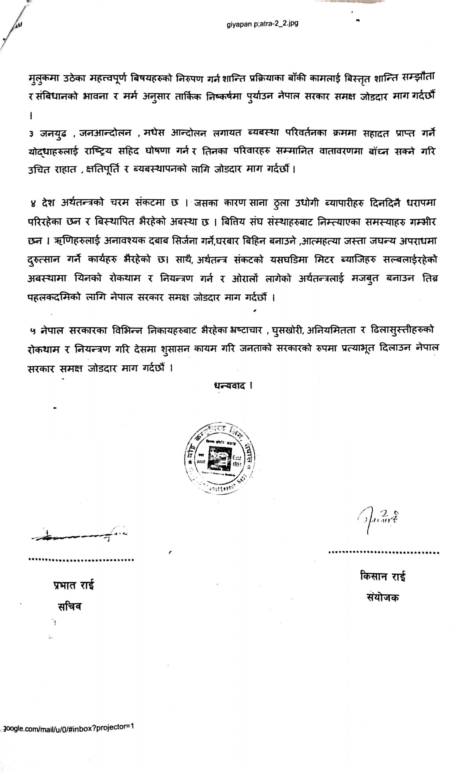 यस्तै, व्यवस्था विरुद्धको गतिविधि नियन्त्रण गर्न र संविधानको रक्षा गर्न, जनयुद्ध, जनआन्दोलन, मधेस आन्दोलन लगायत व्यवस्था परिवर्तनका क्रममा सहादत प्राप्त गरेकाहरुलाई राष्ट्रि«य सहिद घोषणा गरेर उचित क्षतिपुर्ति प्रदान गर्न लगायत ज्ञापन–पत्रमार्फत माग गरिएको छ ।