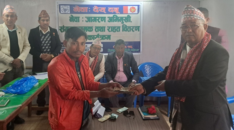 खोटाङ, चैत ४ । नेवा : देय् दबु संस्थाले खोटाङका ६ अग्निपीडित परिवारलाई आर्थीक सहयोग गरेको छ । विभिन्न समयमा घर आगलागि भएका ६ परिवारलाई संस्थाले शनिबार दिक्तेलमा एक कार्यक्रम आयोजना गरी आर्थीक सहयोग गरेको हो ।