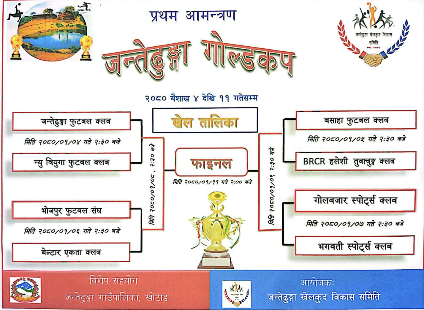जन्तेढुंगा गाउँपालिकाको विशेष सहयोगमा जन्तेढुंगा खेलकुद विकास समितिले गोल्डकपको आयोजना गरेको हो । प्रतियोगिताको उद्घाटन खेलमा वैशाख ४ गते आयोजक जन्तेढुंगा फुटबल क्लब र न्यु त्रियुगा फुटबल क्लबबीच प्रतिस्पर्धा हुनेछ । वैशाख ५ गते हुने दोस्रो खेलमा बसाहा फुटबल क्लब र हलेसी तुवाचुङ क्लबबीच खेल हुँदा तेस्रो खेलमा ६ गते भोजपुर फुटबल संघ र बेल्टार एकता क्लब भिड्ने छन् । पहिलो चरणको अन्तीम खेल ७ गते गोलबजार स्पोट्र्स क्लब र भगवती स्पोट्र्स क्लब मैदान उत्रिने आयोकज जन्तेढुंगा खेलकुद विकास समितिका सचिव अमित राईले जानकारी दिए ।
