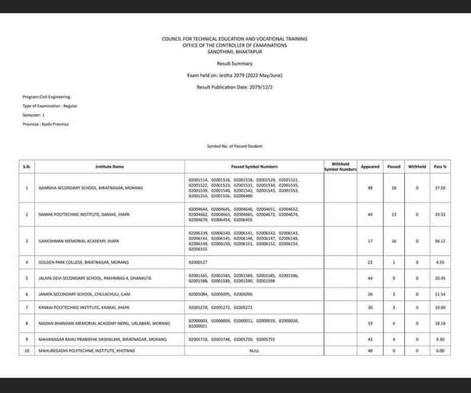 सिभिल इन्जिनियरिङ प्रथम सेमेस्टरमा प्रदेशभरीका प्राविधिक शिक्षालयमध्ये गणेशमान मेमोरियल एकेडेमी, झापाले सबैभन्दा धेरै ९४.१२ प्रतिशत विद्यार्थी उत्तिर्ण गराएको छ । यस्तै, आशर्द सेकेन्डरी स्कुल, बिराटनगर, मोरङको ३७.५० प्रतिशत, दमक पोलिटेक्निक इन्स्टीच्युट, दमक, झापाको २९.५५ प्रतिशत, जालपादेबी सेकेन्डरी स्कुल, पाख्रीबास, धनकुटाको २०.४५ प्रतिशत, मदन भण्डारी मेमोरियल एकेडेमी, उर्लाबारी, मोरङको १८.१८ प्रतिशत, जनता सेकोन्डरी स्कुल, चुलाचुली, इलामको ११.५४ प्रतिशत, कन्काई पोलिटेक्निक इन्स्टीच्युट, कन्काई, झापाको १० प्रतिशत, महानगर बहुप्राविधिक शिक्षालय, बिराटनगर, मोरङको ९.३० प्रतिशत र गोल्डेनपार्क कलेज, बिराटनगर, मोरङको ४.५५ प्रतिशत विद्यार्थी उत्तिर्ण भएका छन् ।