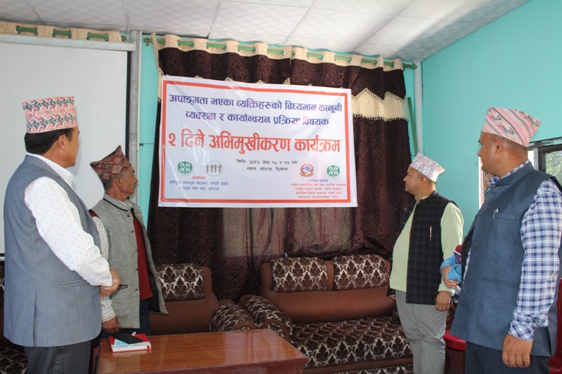 खोटाङ, जेठ १६ । खोटाङका अपाङ्गता भएका ब्यक्तिहरुलाई कानुनी व्यवस्था र कार्यान्वयन प्रक्रिया विषयमा अभिमुखीकरण कार्यक्रम सुरु भएको छ । दिक्तेलमा २ दिनसम्म सञ्चालन हुने कार्यक्रमको मंगलबार जिल्ला समन्वय समिति खोटाङका प्रमुख सनबहादुर राईले उद्घाटन गर्नुभएको हो ।