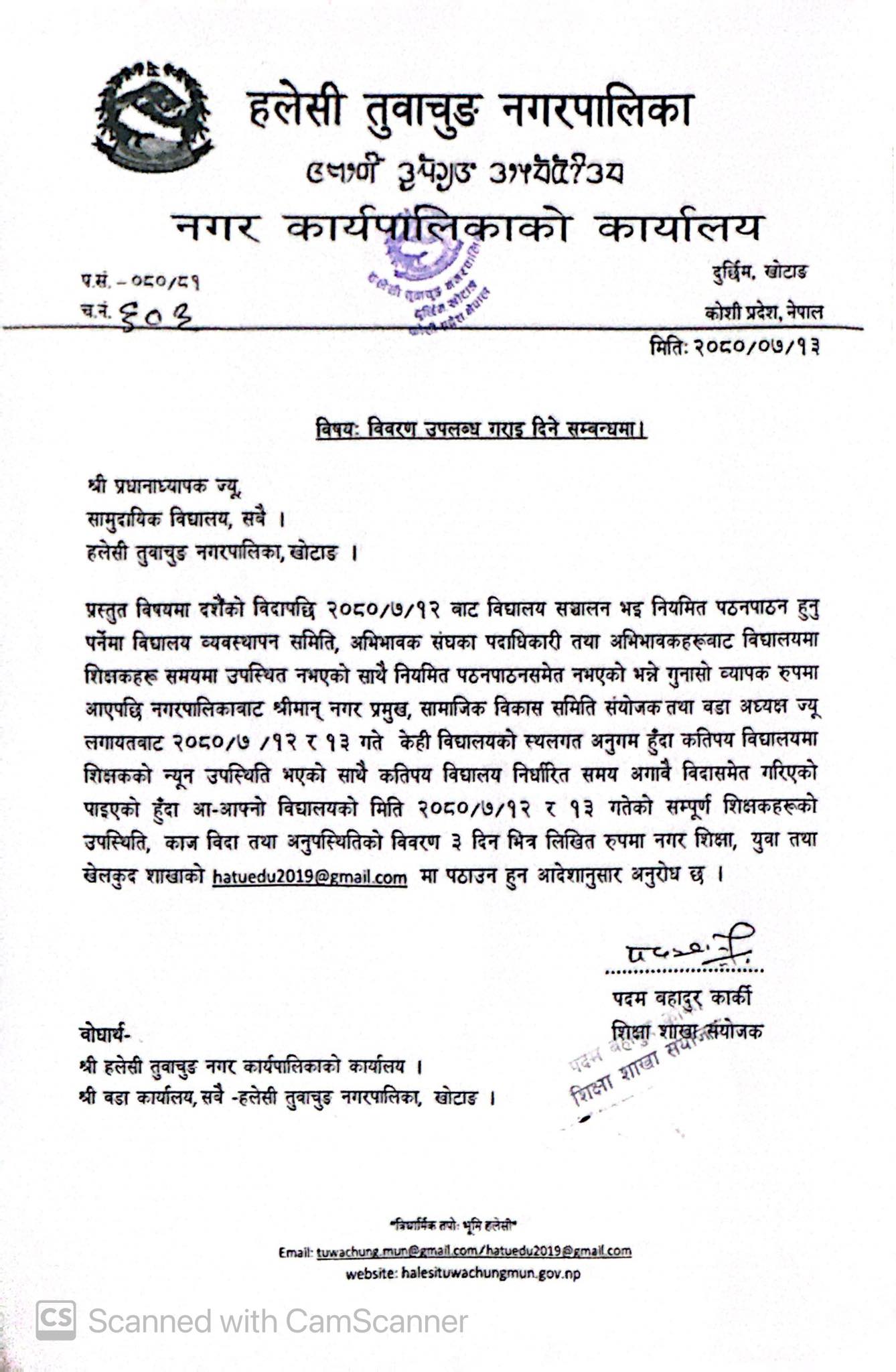 सबै विद्यालयलाई नगरपालिकाको पत्र