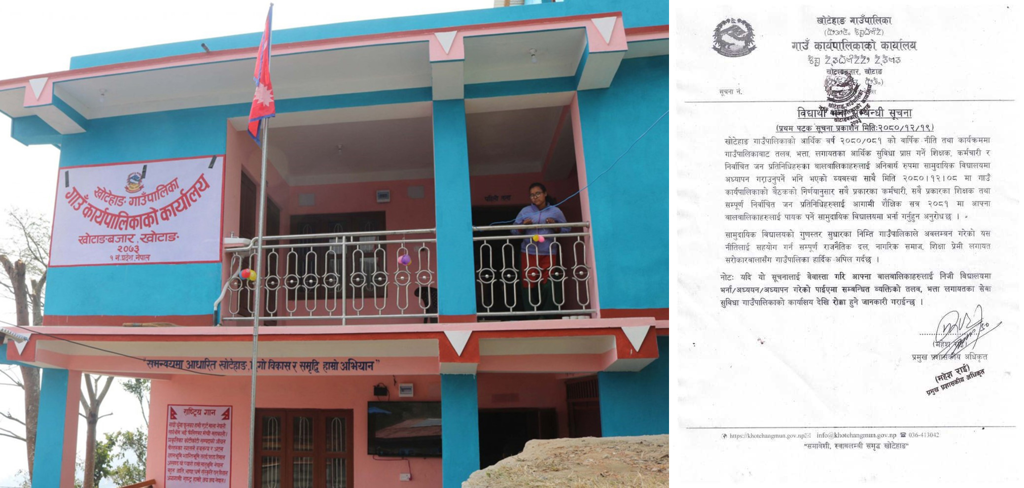 खोटाङ, चैत २० । खोटाङको खोटेहाङ गाउँपालिकाले शिक्षक, कर्मचारी र जनप्रतिनिधिका छोराछोरी अनिवार्य सामुदायिक विद्यालयमा पढाउनु पर्ने निर्णय गरेको छ । गाउँपालिकाबाट तलब, भत्ता लगायतका आर्थिक सुविधा लिएका ब्यक्तिहरुले छोराछोरी सामुदायिक विद्यालयमा नपढाए कारबाही गर्ने गाउँपालिकाले जनाएको छ ।