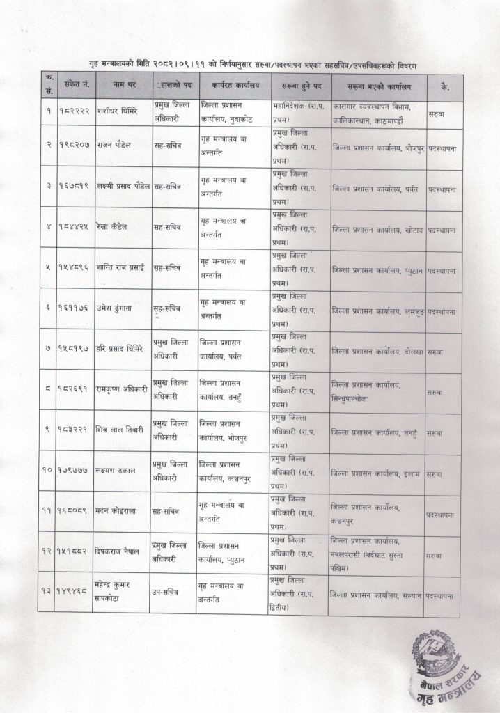 जारी सूचना अनुसार कारागार व्यवस्थापन विभागमा शशीधर घिमिरेलाई पठाइएको छ । भोजपुरको सीडीओमा राजन पौडेललाई पठाइएको छ । पवर्तमा लक्ष्मीप्रसाद पौडेल, खोटाङमा रेखा कँडेल, प्युठानमा शान्ति राज प्रसाईंलाई पठाइएको छ ।